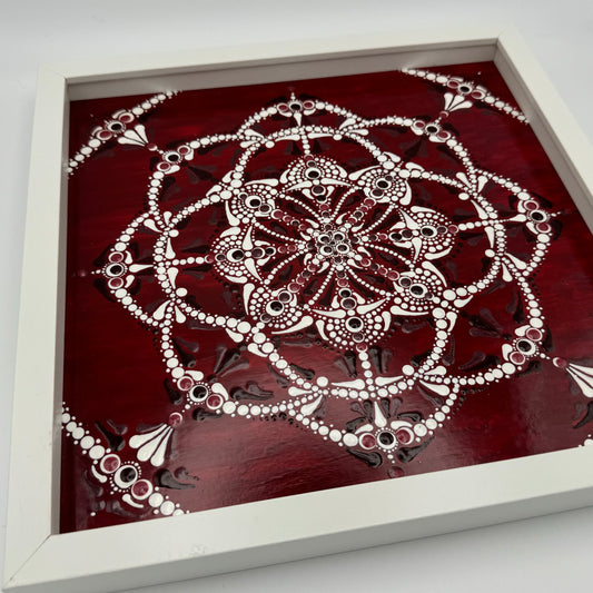 Ornate Open-Frame Deep Wine Red & White Mandala with Black Iridescent Accents