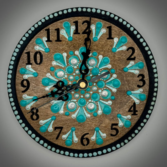 Art Clock on 45 Vinyl Record, Teal and Turquoise Mandala with Wood Inlay