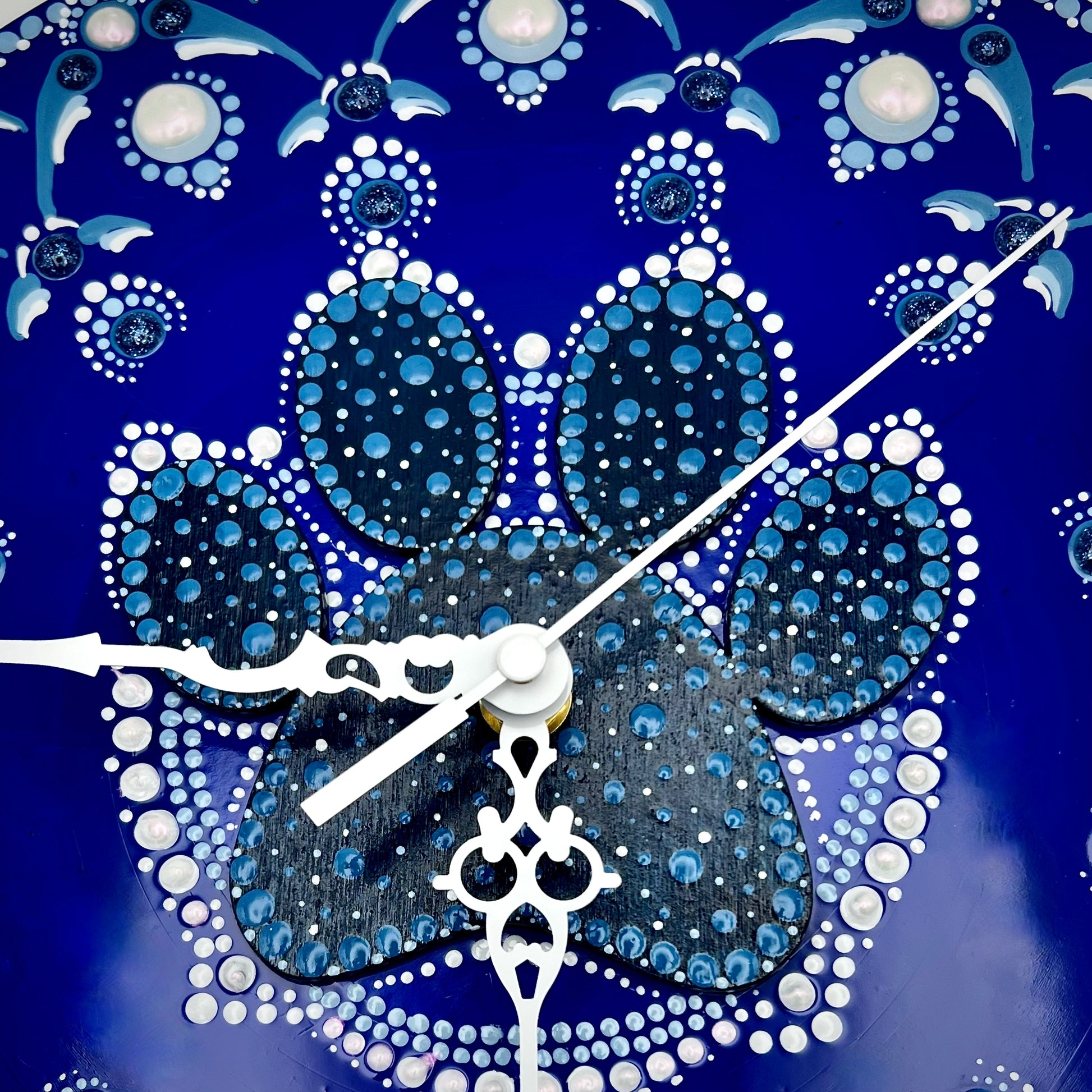 Hand painted 12 inch vinyl records transformed into one-of-a-kind clocks. Each clock boasts a distinctive design created with iridescent and layered paints, as well as intricate details that add depth and dimension.