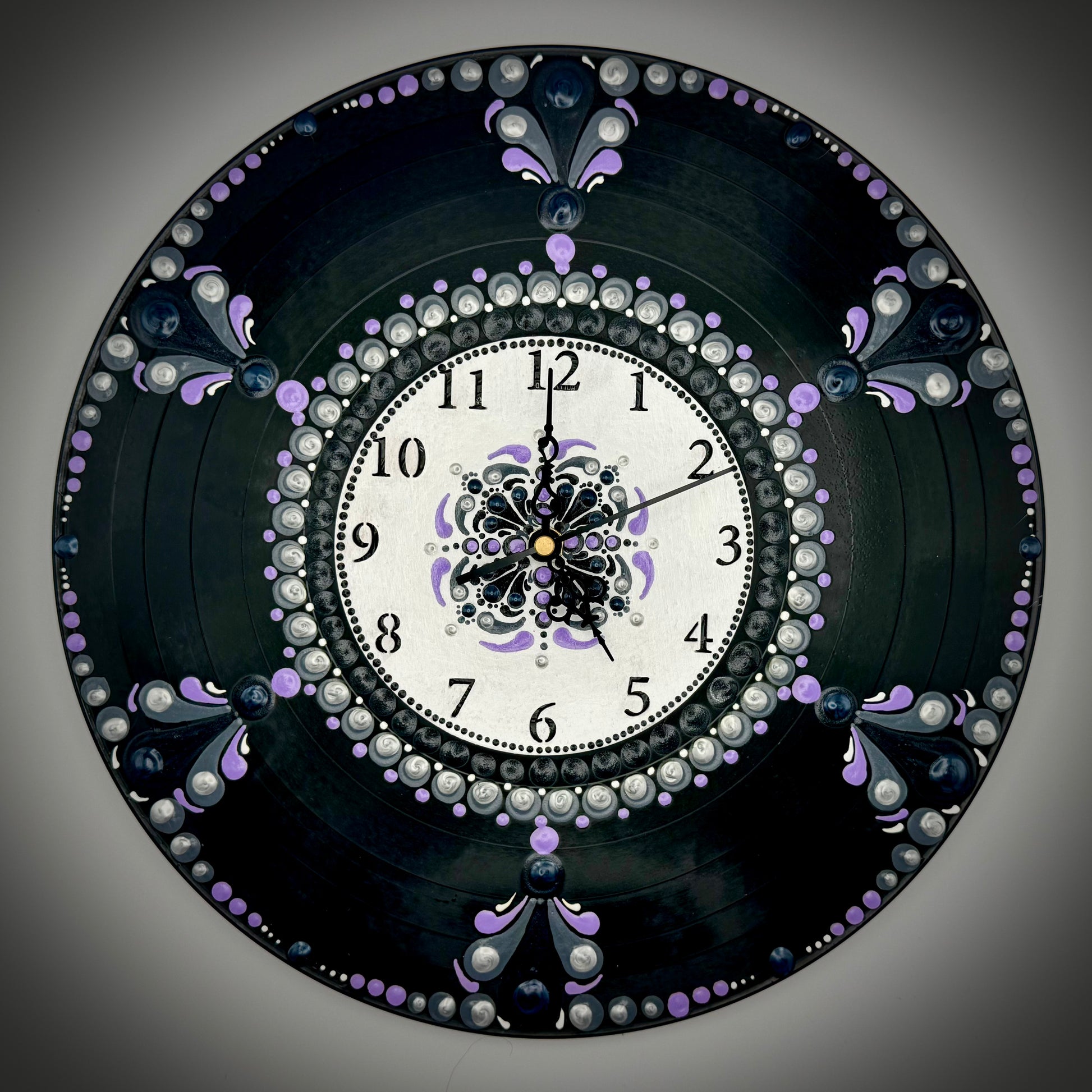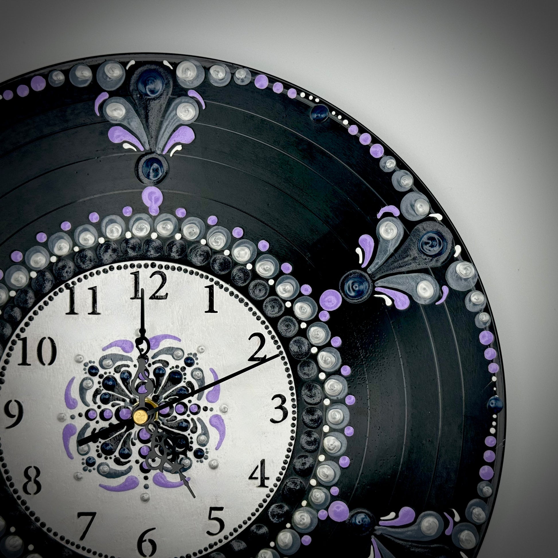 Hand painted 12 inch vinyl records transformed into one-of-a-kind clocks. Each clock boasts a distinctive design created with iridescent and layered paints, as well as intricate details that add depth and dimension.