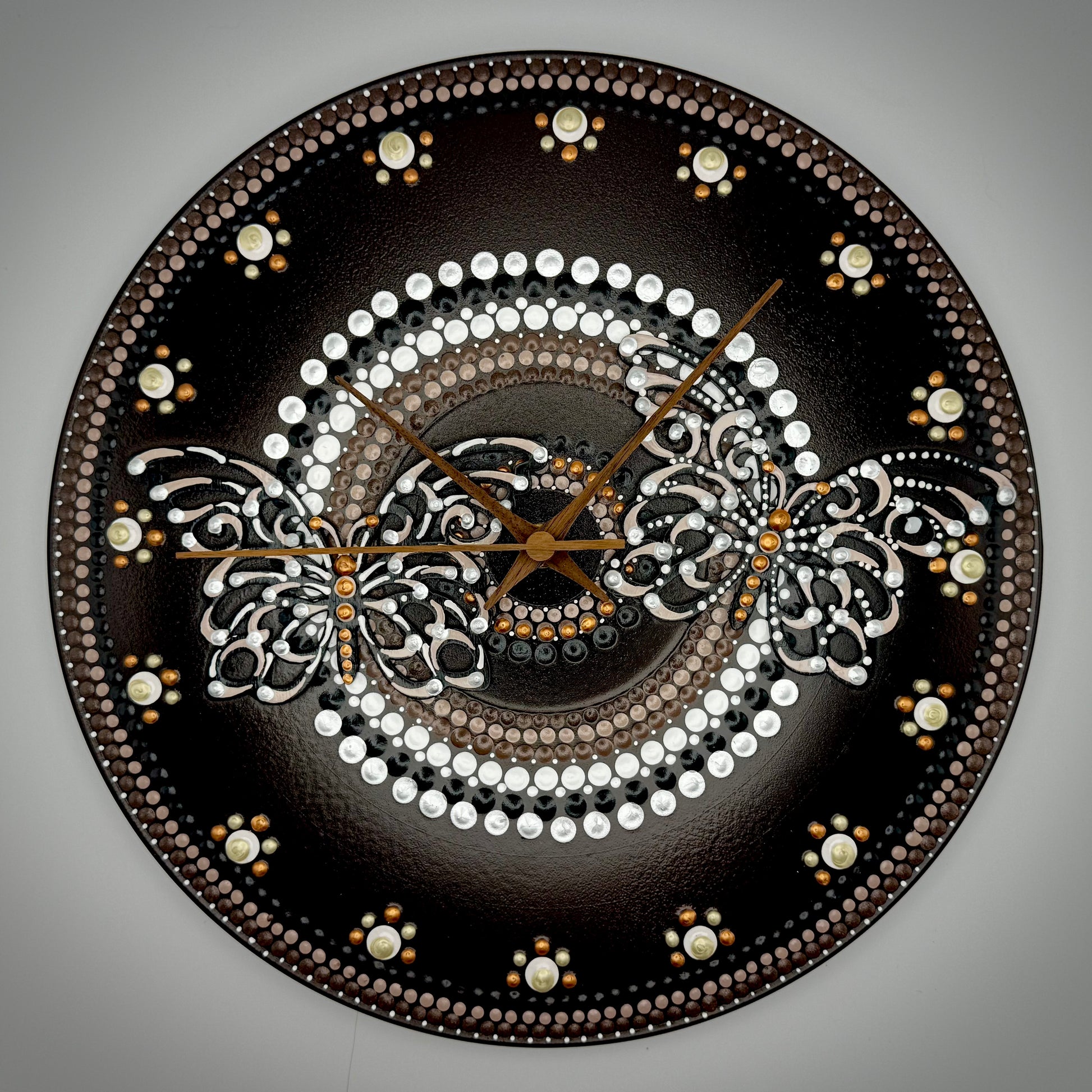Hand painted 12 inch vinyl records transformed into one-of-a-kind clocks. Each clock boasts a distinctive design created with iridescent and layered paints, as well as intricate details that add depth and dimension.
