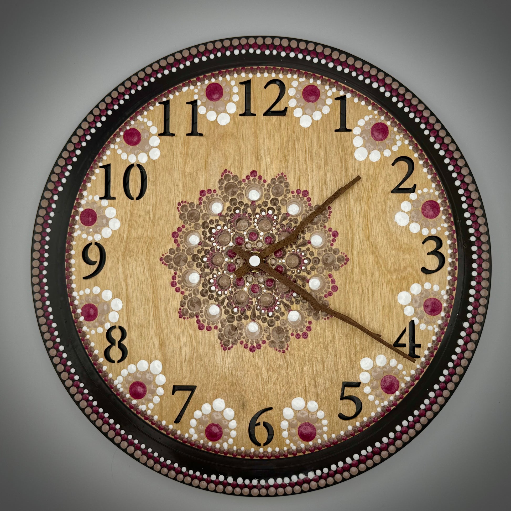 Hand painted 12 inch vinyl records transformed into one-of-a-kind clocks. Each clock boasts a distinctive design created with iridescent and layered paints, as well as intricate details that add depth and dimension.