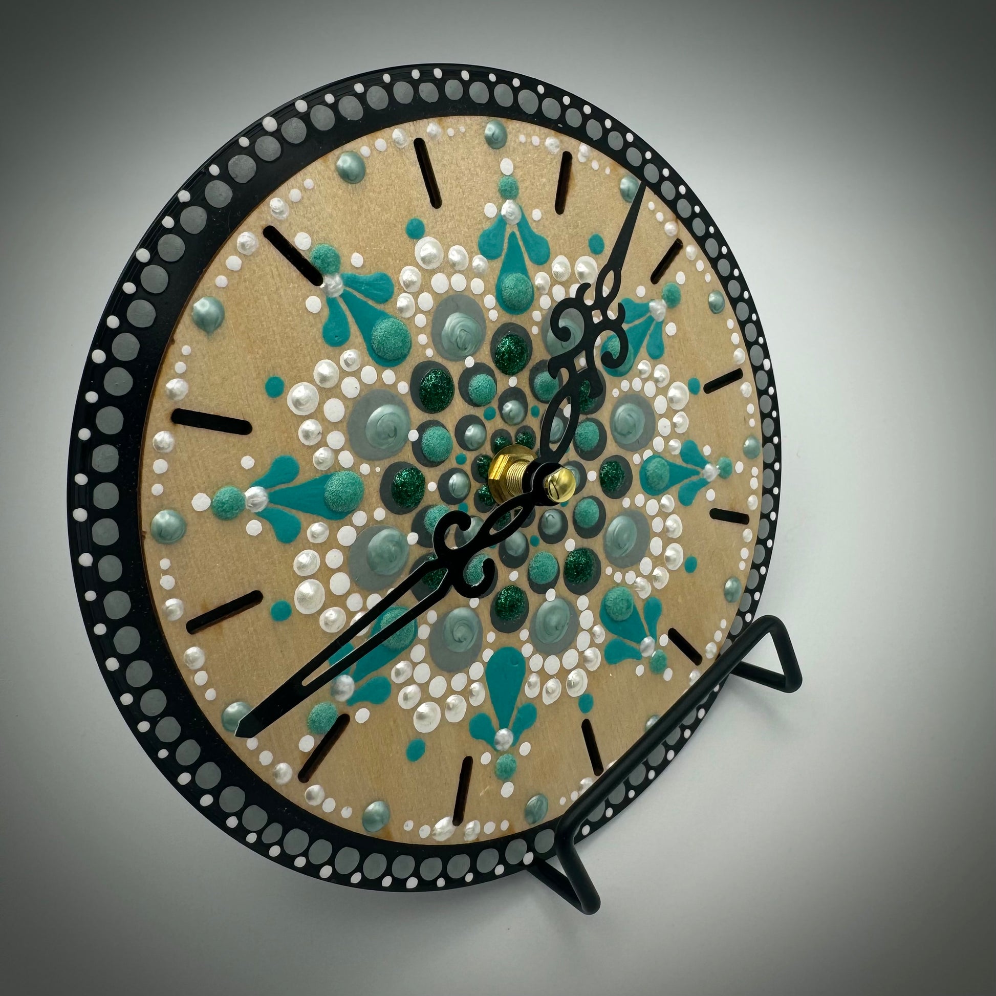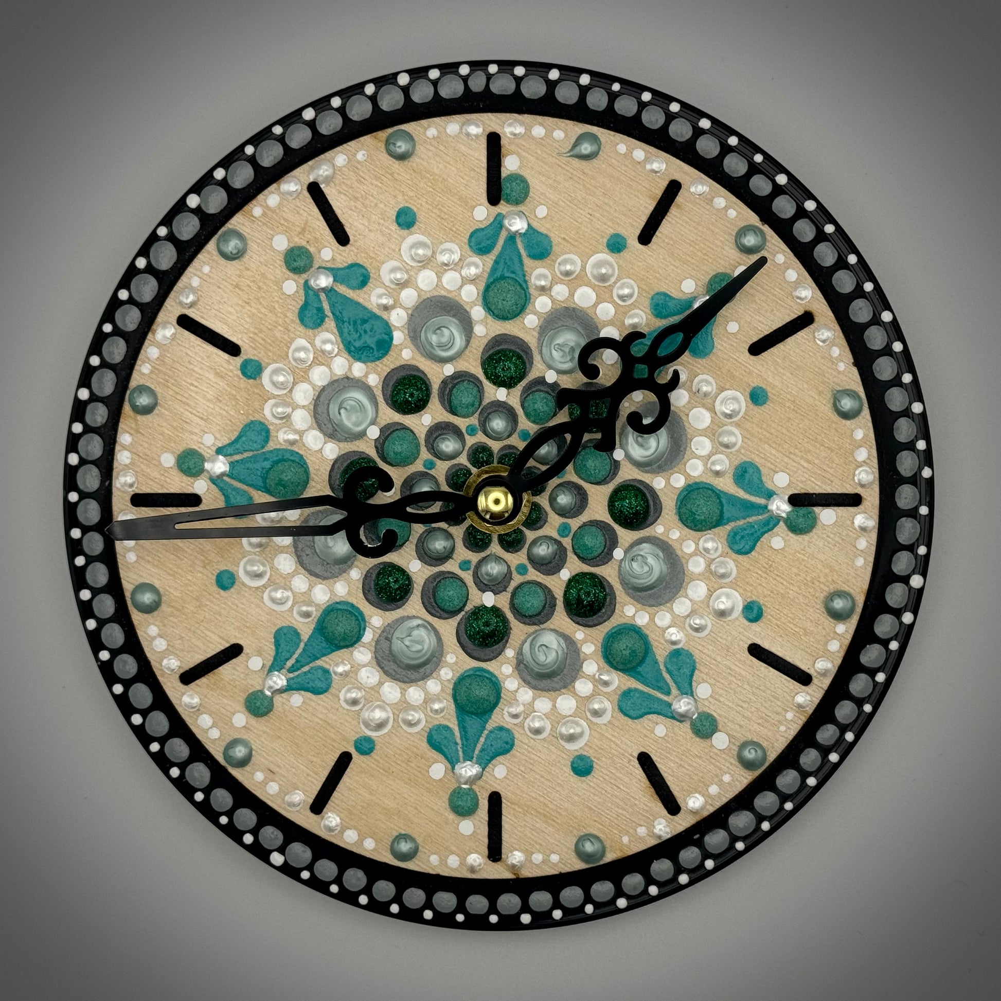 Art Clock on 45 Vinyl Record, Teal and Turquoise Mandala, Wooden Laser Inlay