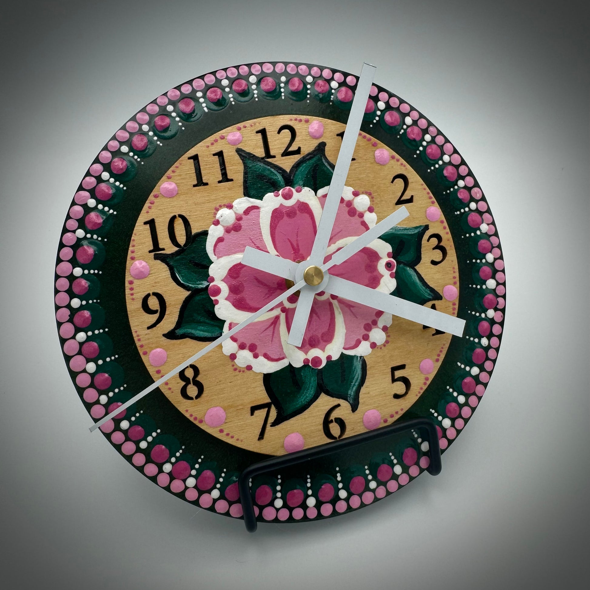 Art Clock on 45 Vinyl Record, Painted Pink Flower with Laser Cut Wood Inlay