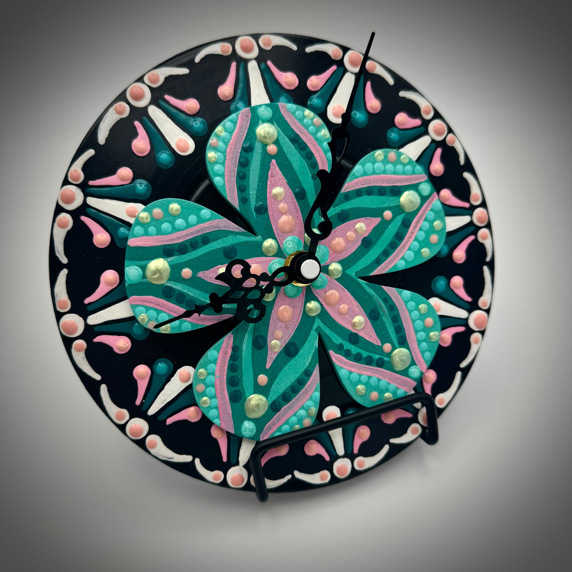 Art Clock on 45 Vinyl Record, Teal and Pink Mandala, Raised Wooden Flower Inlay