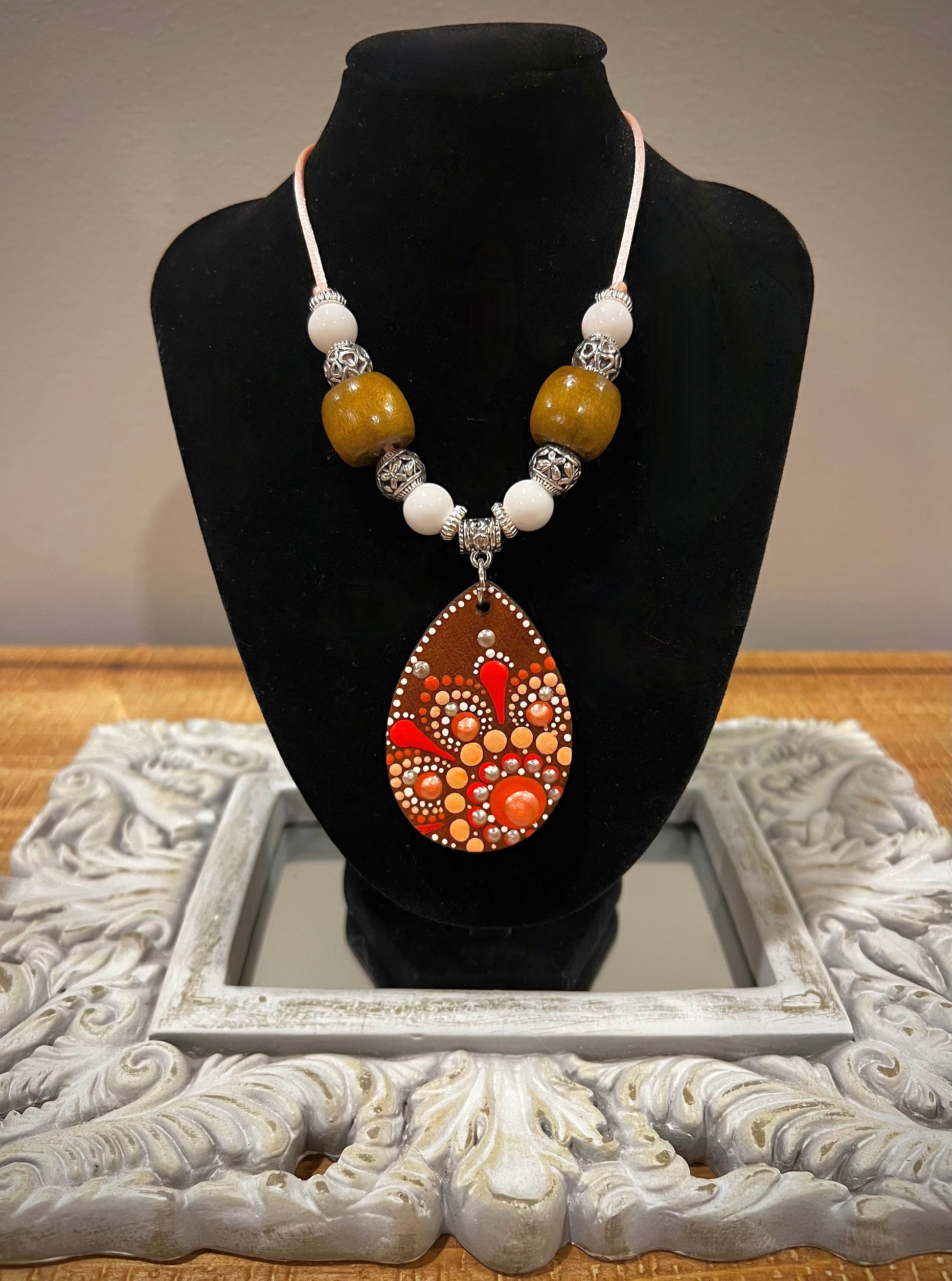 Hand-painted wooden pendant necklaces with satin cording that can be easily adjusted in length. Each piece is embellished with a unique combination of wood, metal, stone, and/or glass beads, making it a one-of-a-kind accessory. Perfect for both casual occasions or a night out. The convenient slipknot fastener ensures versatile styling options for any desired look.