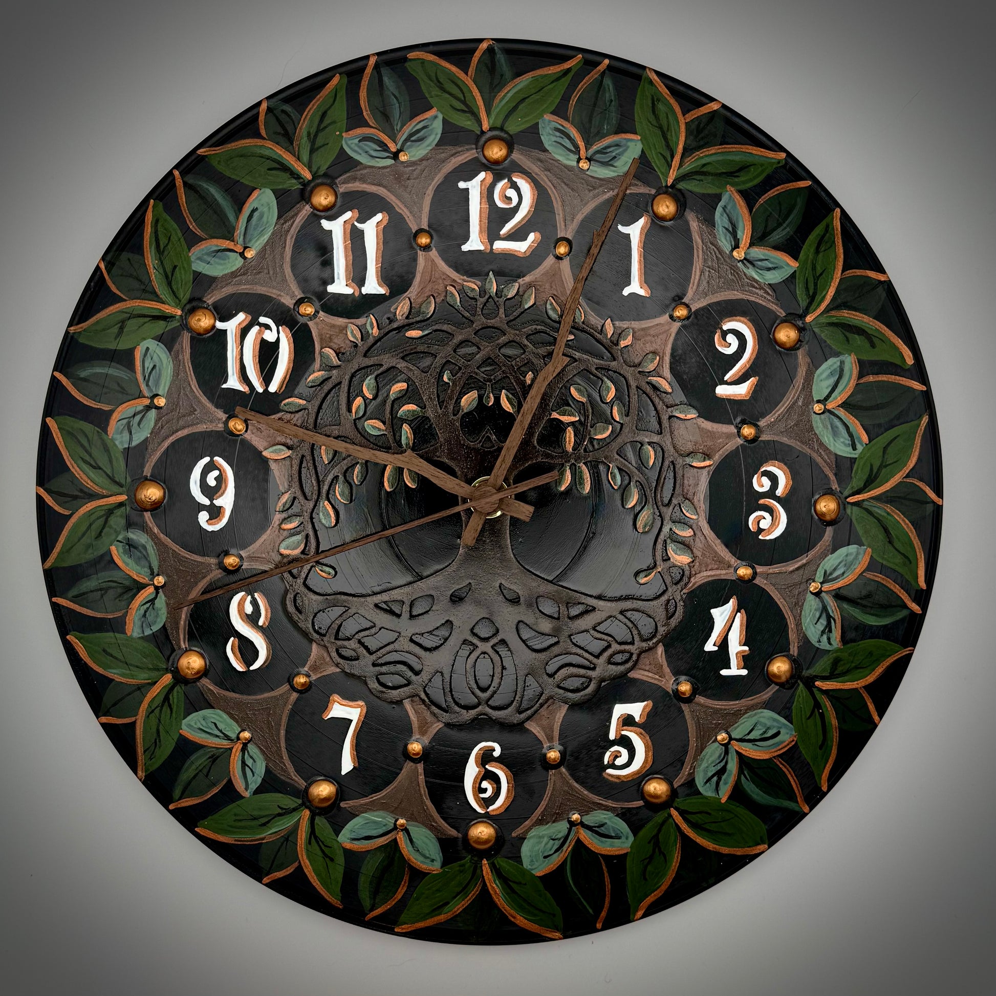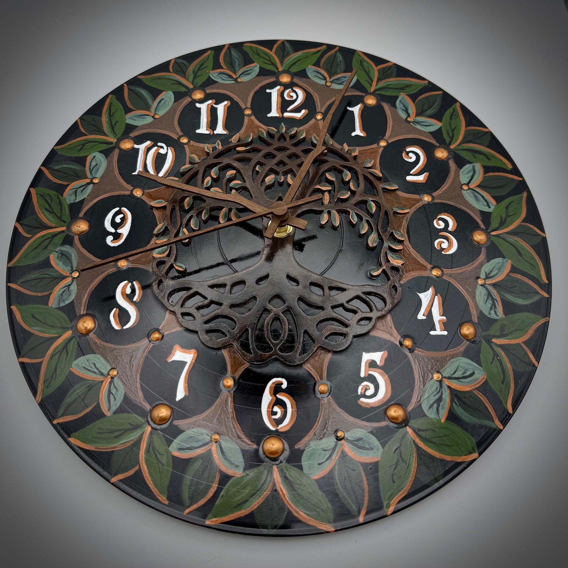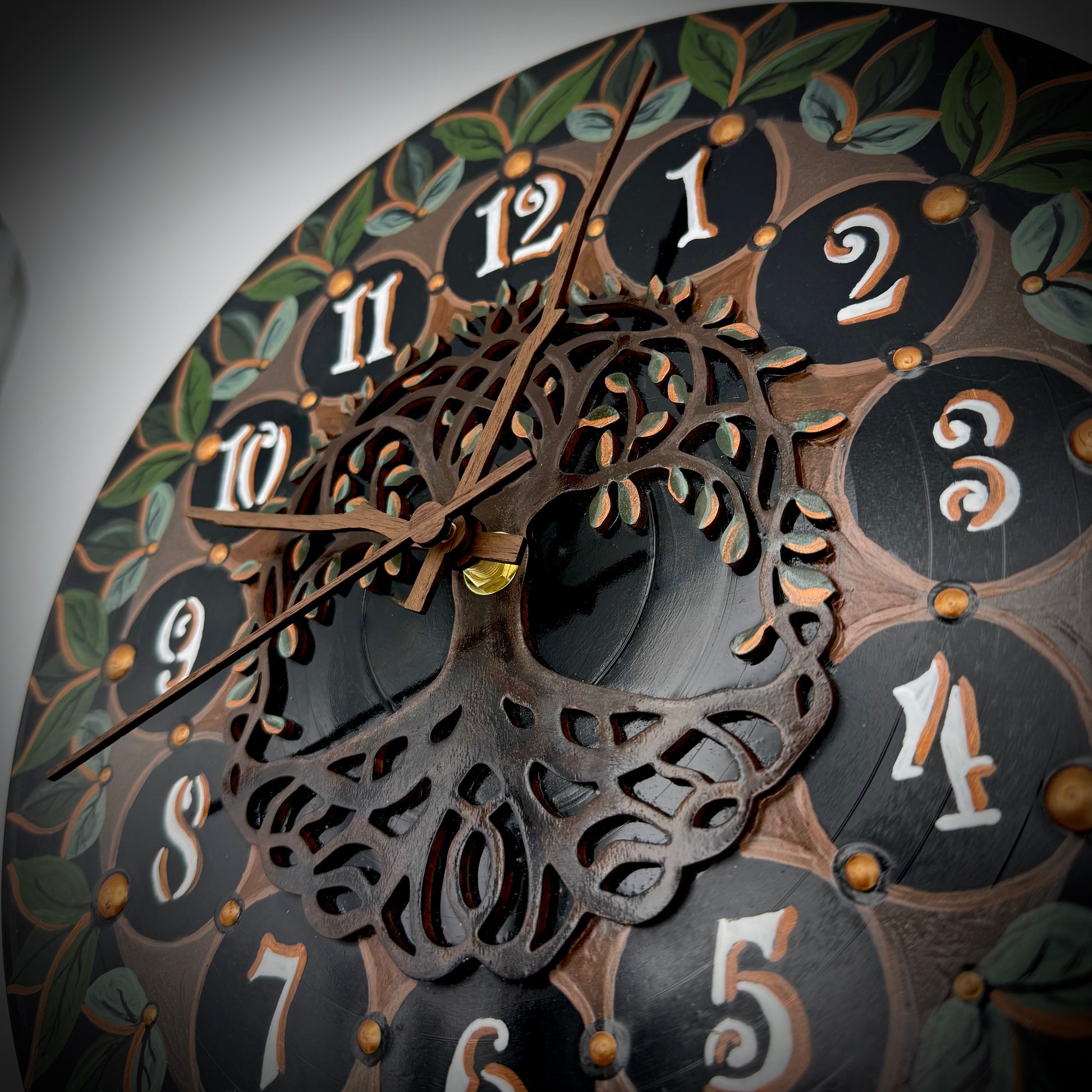 Intricate Vinyl Record Clock; Tree of Life with Wood Number Inlay & Painted Leave Design
