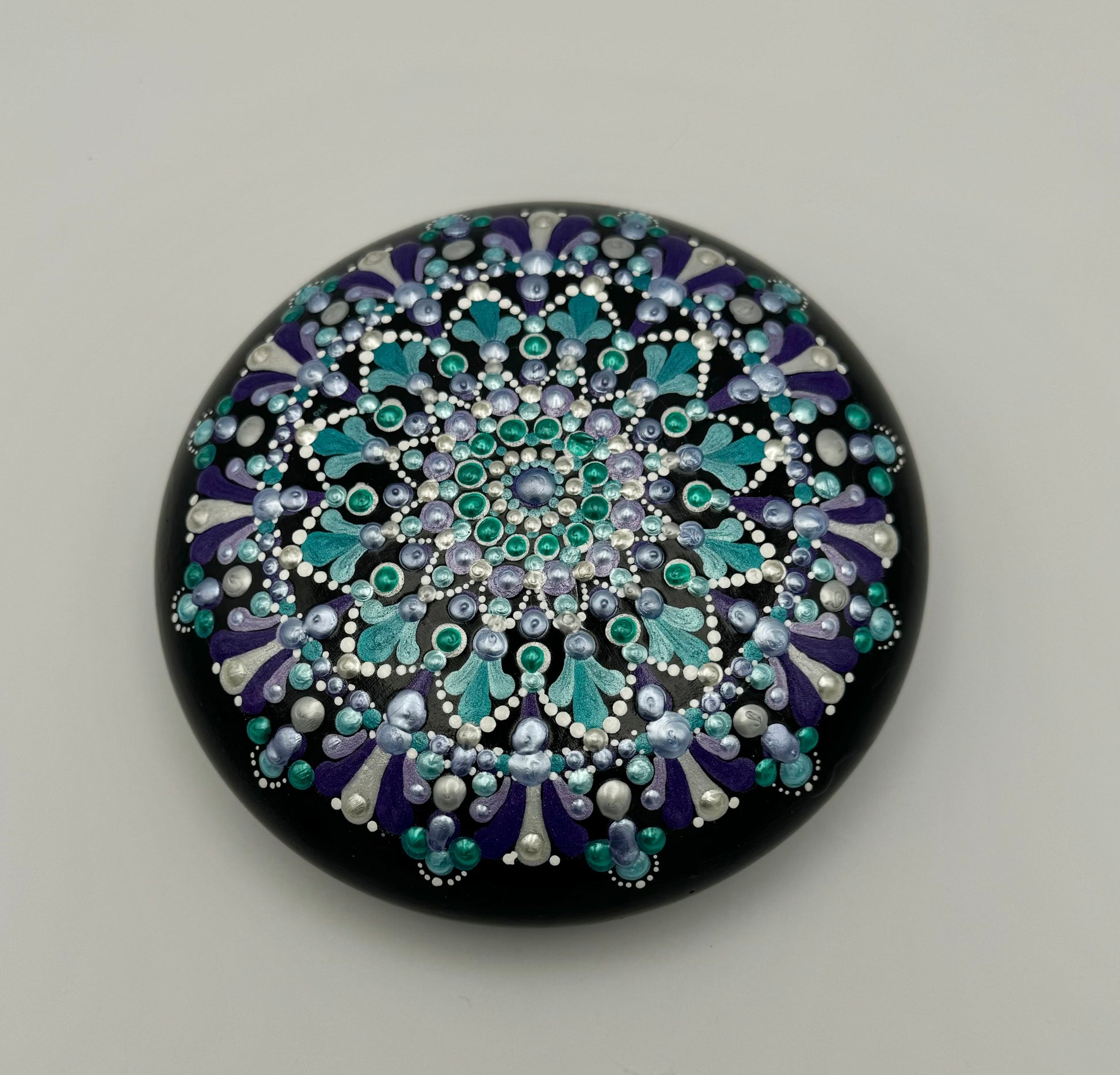 6.5 inch hand-painted mandala stone in various shades of teal and purple. Accented with sliver tones and sealed in an iridescent glaze.