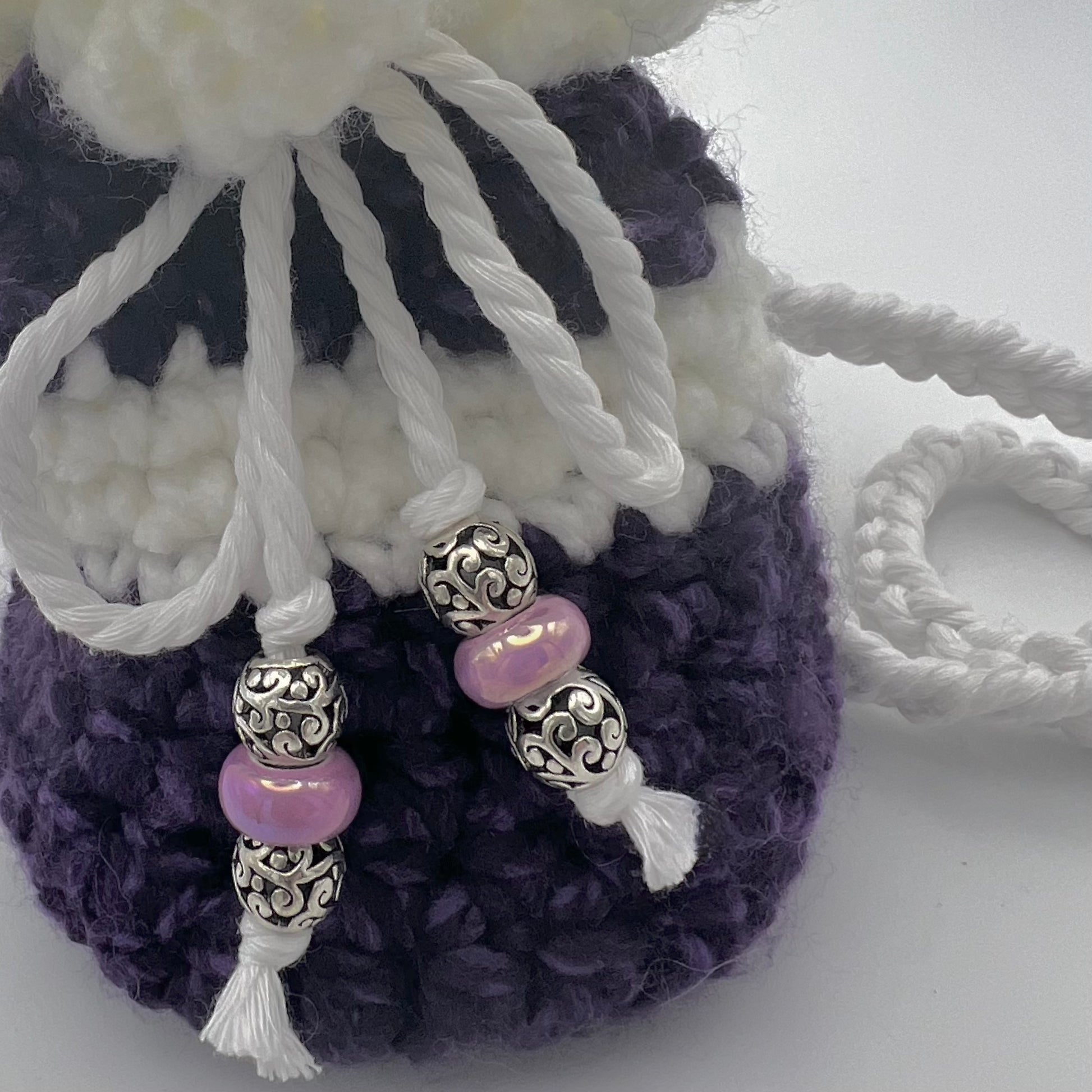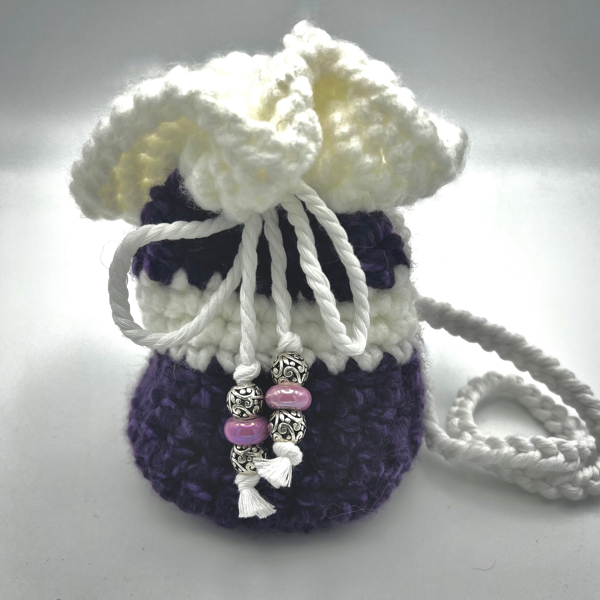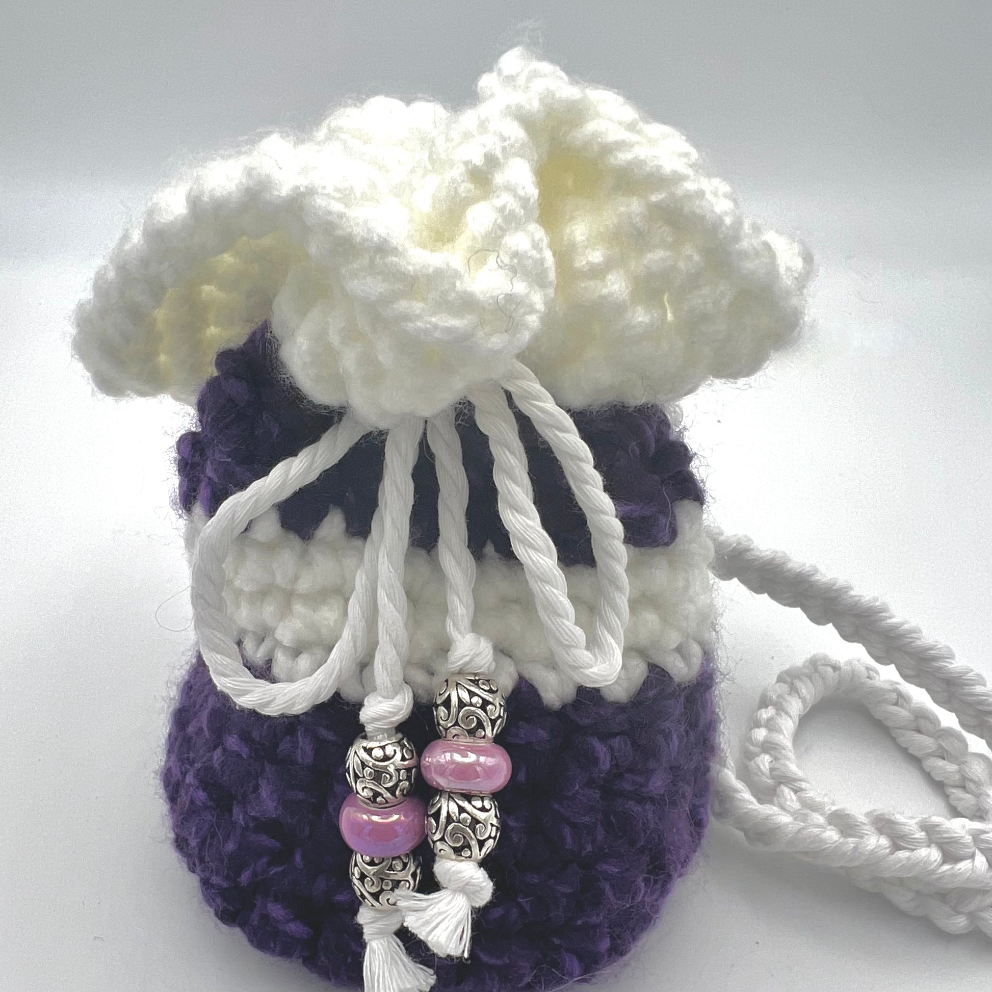 Purple and White Satchel with resin and silver beaded accents. Perfect to carry small items to special events, and outings. Handmade with extra thick reinforced yarn and hand braided cotton straps.