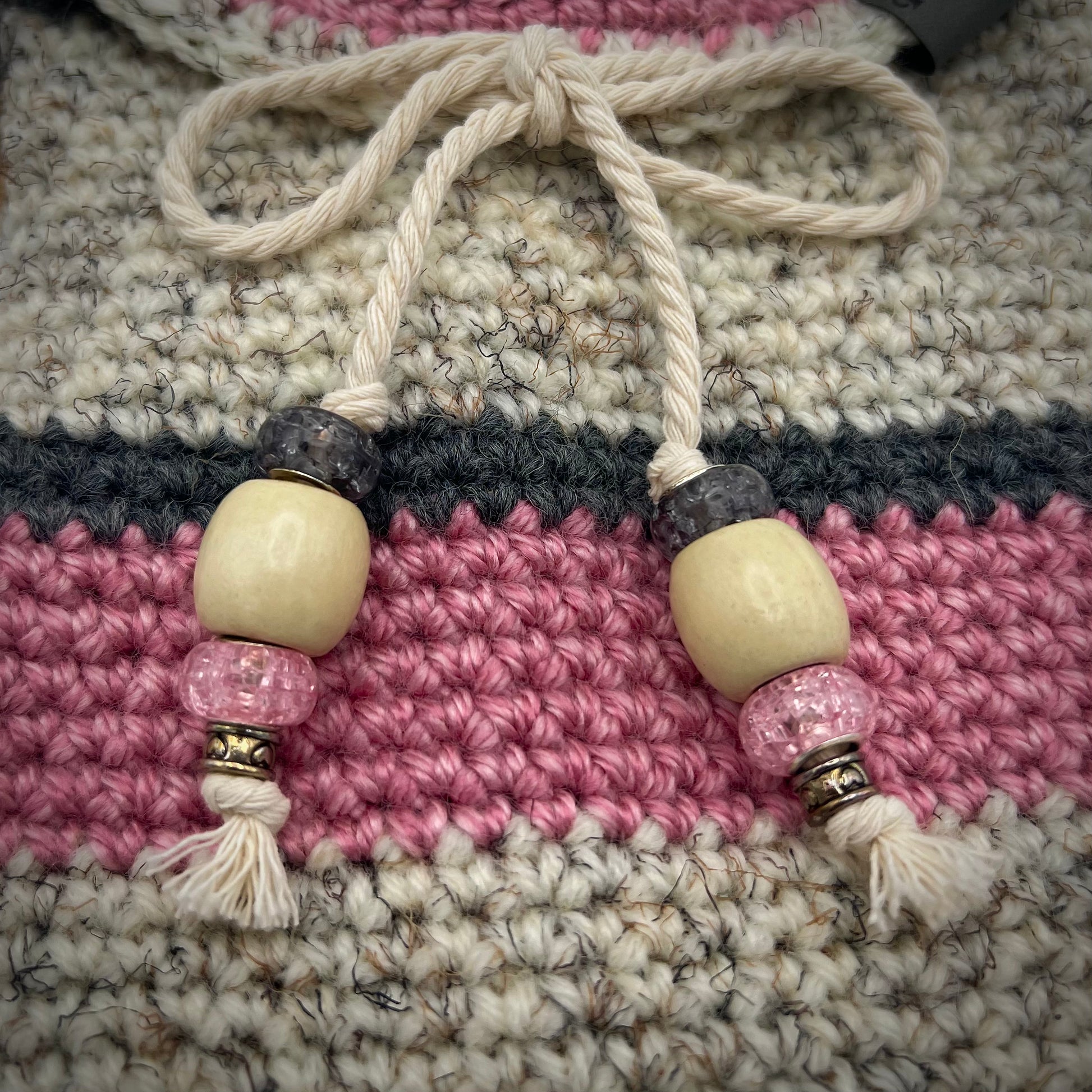 Pink and Gray Crossbody Satchel with tie closure and wooden, silver, and glass bead accents. Perfect to carry the essentials for concerts, special events, and outings. Handmade with extra thick reinforced yarn and hand braided cotton straps.
