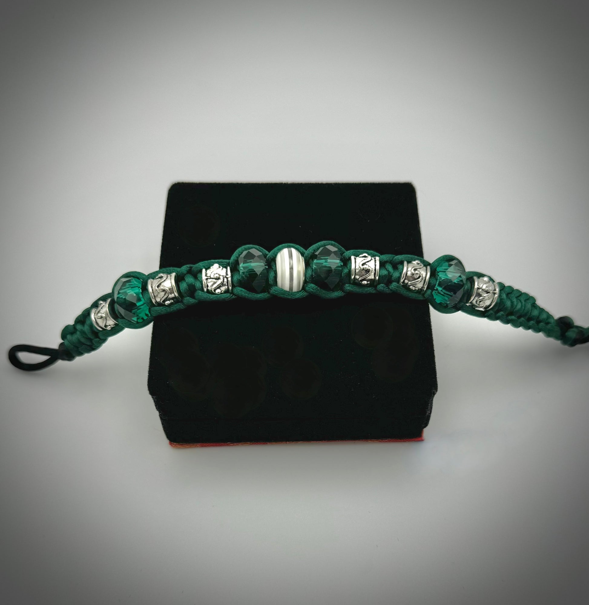 Green and Silver Beadwork; Silk Macrame Bracelet