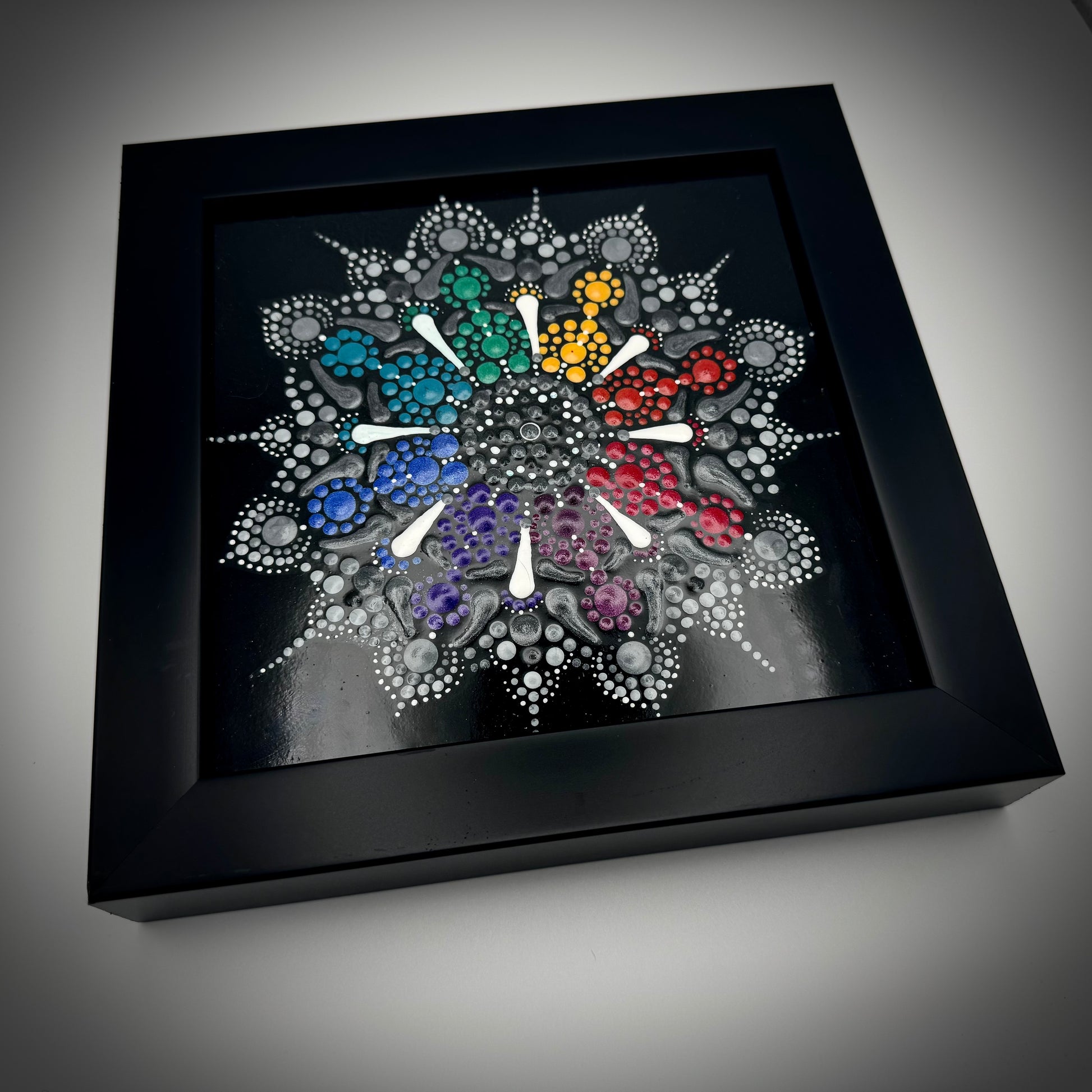 Hand-Painted Original Rainbow Dot Mandala. Comes with a modern open matte 8x8 black frame.